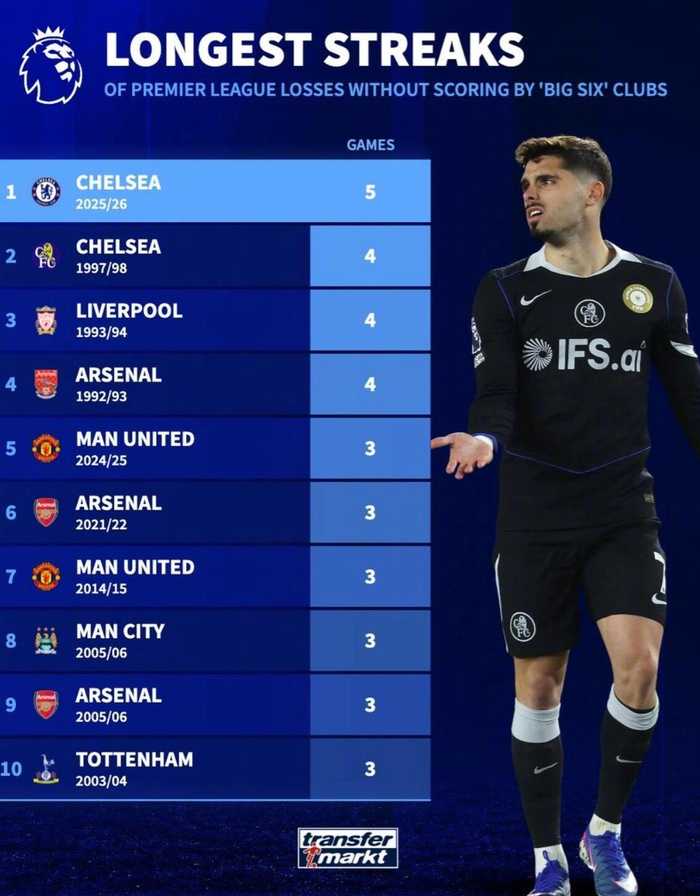 切尔西5连败零进球居英超Big6榜首 发布时间:2026-04-22 23:29:16 | 来源:咪咕体育直播 德转统计了英超Big6球队零进球连败排行榜。 本赛季切尔西联赛连败5场并且一球未进排名第一。 标签: 上一篇: 46岁小罗再现马赛回旋绝技,白发传奇引爆球迷欢呼 下一篇: 巴萨1比0塞尔塔,VAR取消费兰进球引争议